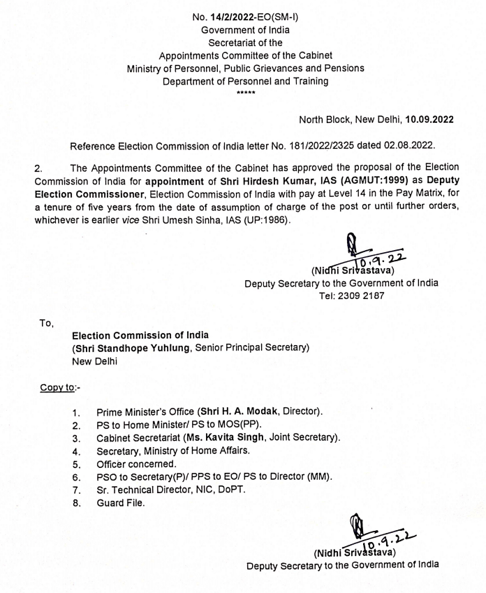 इस बीच चुनाव आयोग को लेकर भी अहम जानकारी सामने आ रही है। बताया जा रहा है कि जम्मू और कश्मीर के मुख्य चुनाव अधिकारी हिरदेश कुमार को पांच साल के कार्यकाल के लिए भारत के चुनाव आयोग के उप-चुनाव आयुक्त के रूप में नियुक्त किया गया है।