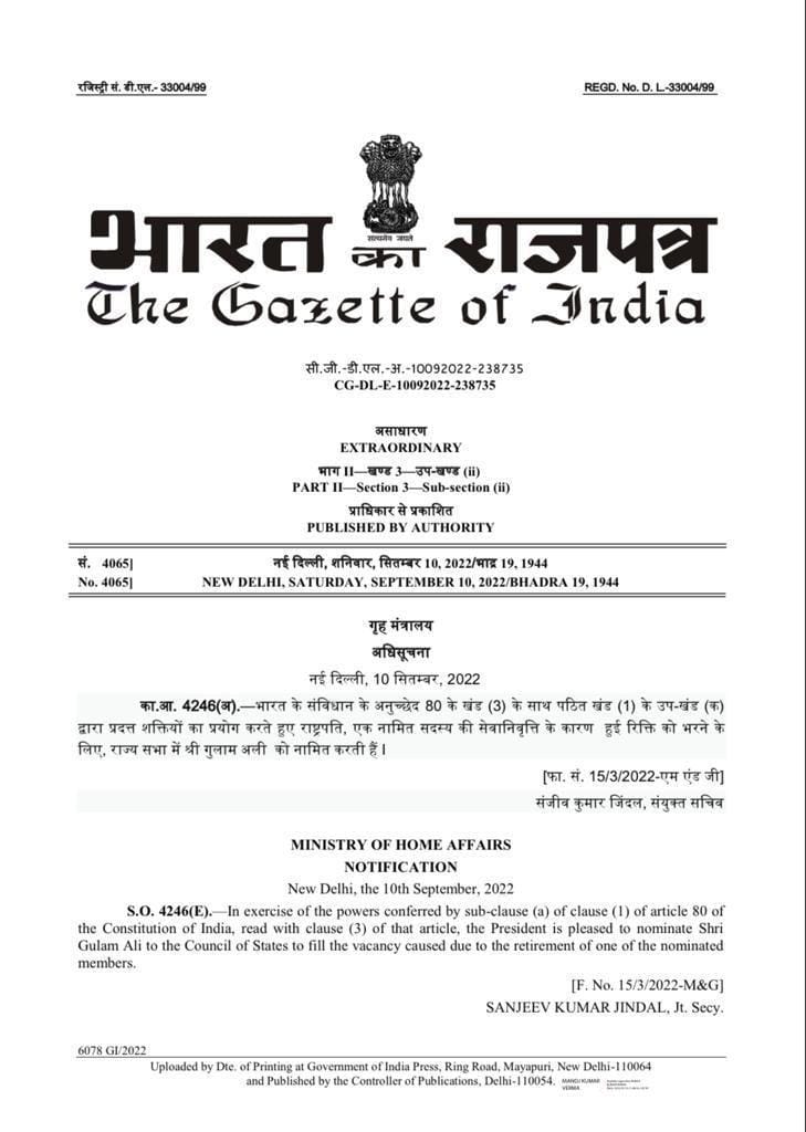 राष्ट्रपति द्रौपदी मुर्मू ने गुलाम अली को जम्मू-कश्मीर से राज्यसभा के लिए नियुक्त किया है। गृह मंत्रालय ने एक अधिसूचना में इसकी जानकारी दी है। अधिसूचना के मुताबिक, जम्मू-कश्मीर के गुर्जर मुस्लिम समुदाय के गुलाम अली को राज्यसभा के लिए मनोनीत किया गया है। इसे एक अहम कदम माना जा रहा है। अनुच्छेद 370 हटाए जाने से पहले इस समुदाय को ज्यादा तवज्जो नहीं दी जाती थी।