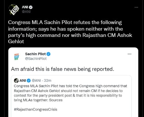 ANI ने सूत्रों के हवाले से दावा किया था कि कांग्रेस विधायक सचिन पायलट समर्थन करने वाले विधायकों के अलावा अन्य विधायकों के लगातार संपर्क में हैं। उन्होंने अपने समर्थकों से आलाकमान के फैसले का इंतजार करने को कहा है।