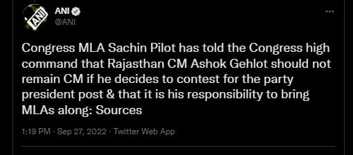 सूत्रों के अनुसार कांग्रेस विधायक सचिन पायलट ने कांग्रेस आलाकमान से कहा है कि अगर राजस्थान के सीएम अशोक गहलोत पार्टी अध्यक्ष पद के लिए चुनाव लड़ने का फैसला करते हैं तो उन्हें सीएम नहीं रहना चाहिए। इसके साथ ही विधायकों को साथ लाने की उनकी जिम्मेदारी है। कांग्रेस विधायक सचिन पायलट समर्थन करने वाले विधायकों के अलावा अन्य विधायकों के लगातार संपर्क में हैं। उन्होंने आगे अपने समर्थकों से आलाकमान के फैसले का इंतजार करने को कहा है।